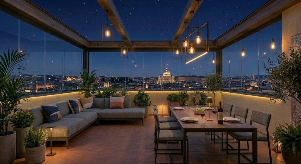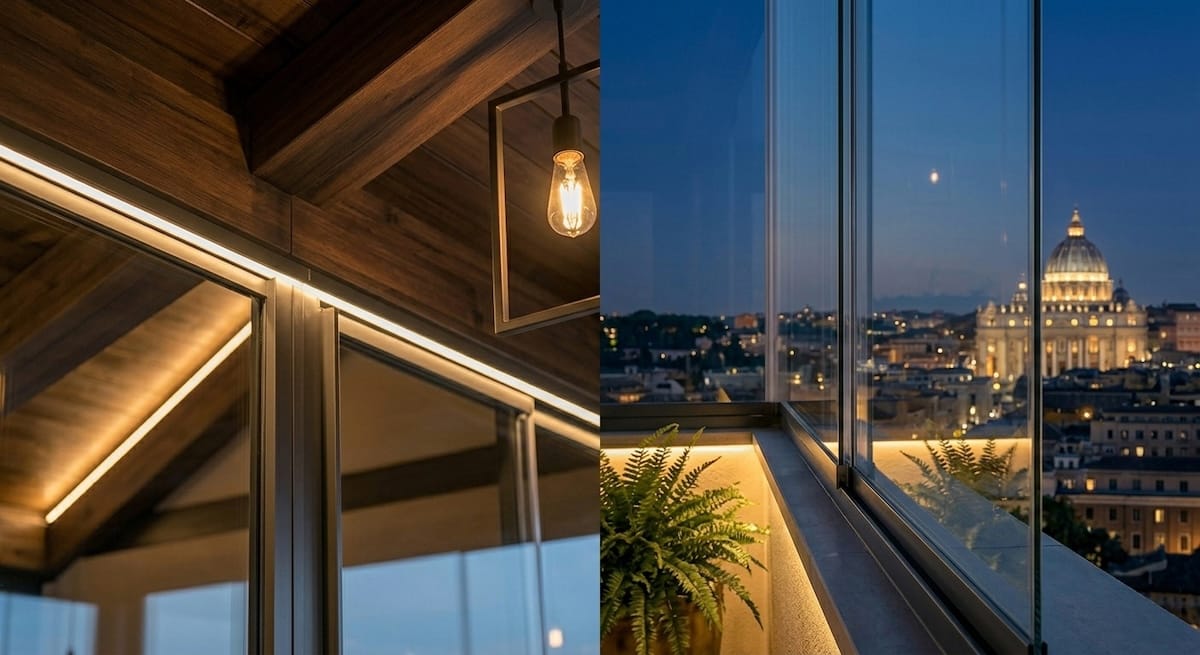 Un terrazzo con vetrate panoramiche è uno spazio estremamente luminoso durante il giorno. Ma è nelle ore serali che può esprimere tutto il suo potenziale. La giusta illuminazione permette di trasformarlo in un ambiente accogliente, elegante e perfettamente vivibile anche dopo il tramonto.
